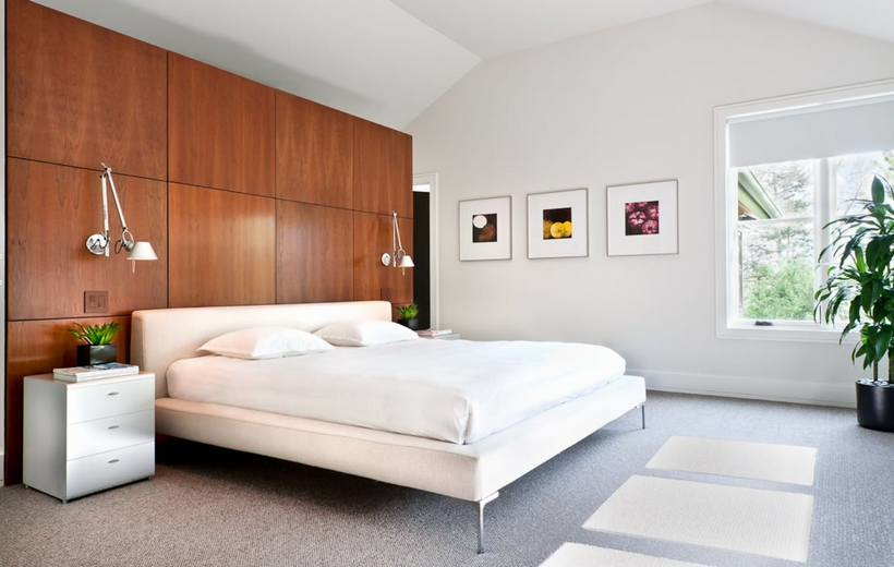 Панели из клееной деревянной стружки выглядят очень презентабельно за счет ламинации, а стоят при этом значительно дешевле деревянных аналогов. Панели помимо декоративной функции удерживают в спальне тепло и звук.