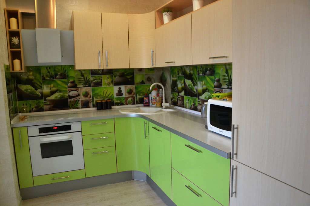 Если вам нравится керамическая плитка, но хочется подобрать более бюджетный вариант для декора стен, лучше выбрать ламинированные ДСП или МДФ панели. Также модели богаты на смелые и броские цвета и рисунки. Посмотрим на фото и увидим, что ламинация позволяет создавать сочные шедевры, например, популярный декор в виде фруктов или абстрактные изображения.