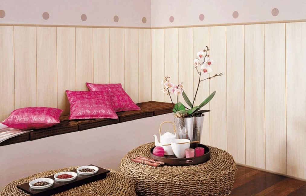 Панели из поливинилхлорида производят в разной цветовой гамме. На них может быть нанесен рисунок в виде мозаики, кирпичной кладки, древесины или другого природного материала. ПВХ рейки или плиты можно установить на потолок, где они будут отлично сочетаться с врезанными в них светильниками.