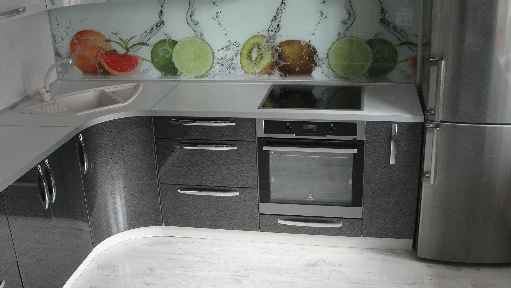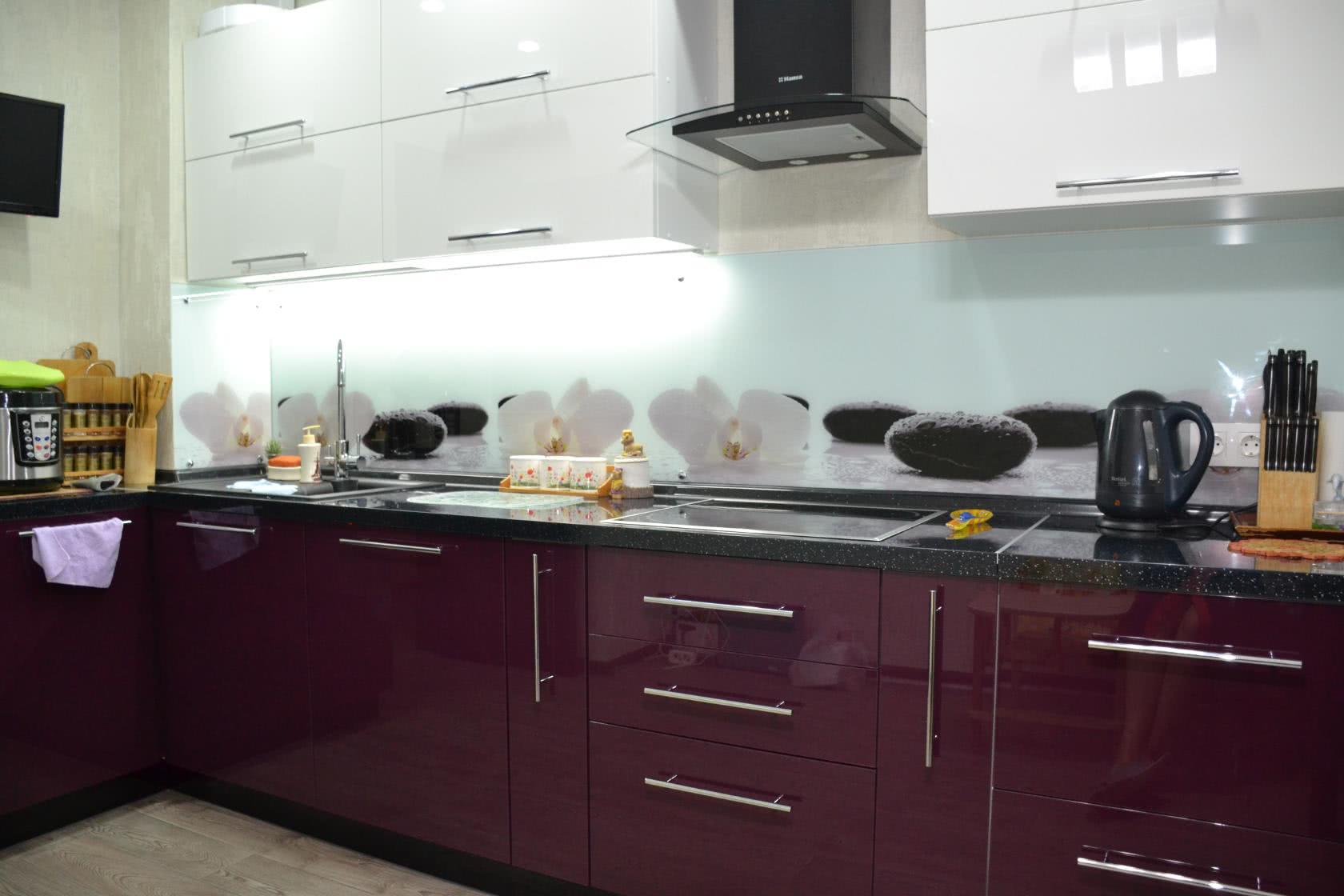 – как правило, это более дорогостоящий вид кухонного фартука. При установлении требует наличия специального каркаса или идеально ровной стены. Самым большим преимуществом этой отделки есть оригинальность и индивидуальность — с помощью фотопечати на стекло можно нанести любой рисунок. К тому же можно заказать скинали с подсветкой. Большим минусом есть в ограничении установления тех же розеток. Нужно либо заказывать изготовление стекла специально с отверстиями для размещения розеток так, как удобно хозяину кухни, либо нужно искать другое место для электрики. При выборе скинали из каленого стекла можно не бояться устанавливать его сразу за плитой.