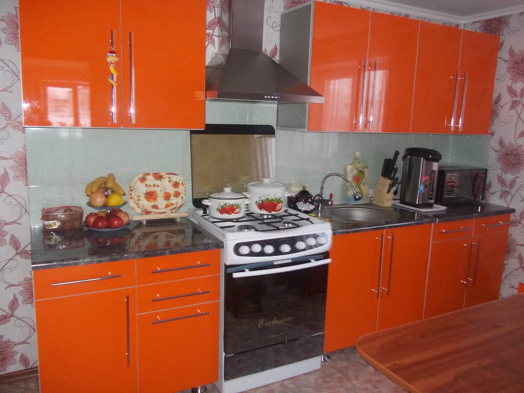 Отделка фасада кухни пленкой ПВХ сегодня востребована ввиду невысокой цены подобных вариантов. ПВХ-пленка, покрывающая фасад кухни, достаточно устойчива к воздействию воды, с ее поверхности легко смываются жирные пятна.