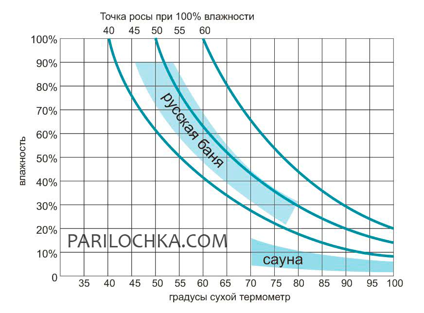 Обратите внимание на то, каким градусам соответствует какая влажность в очерченных областях. Такой график мы бы рекомендовали изучить тем, кто считает, что вполне допустимо и температуру поднять, и водички побольше на камни плеснуть