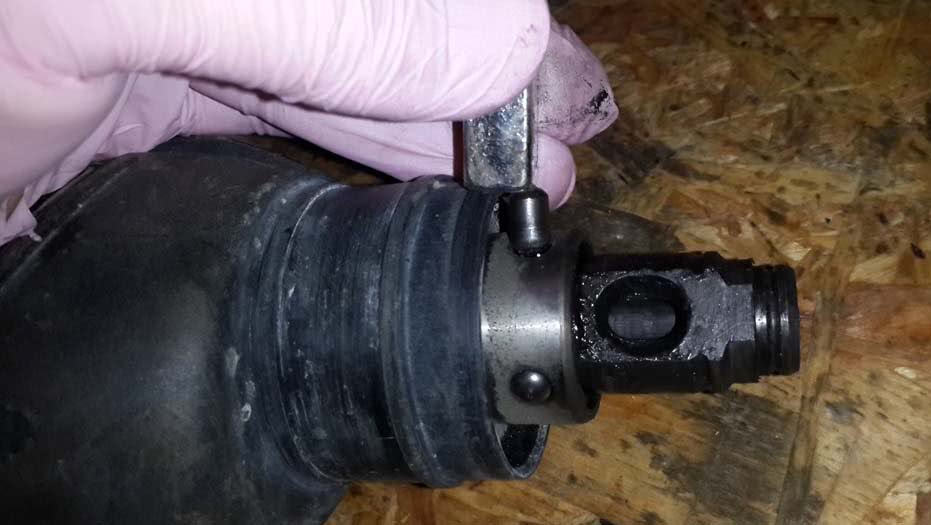 - За пластиковой частью расположен SDS зажим, который состоит из пружины, шайбы и шарика. Первым нужно вынуть шарик, после шайбу и пружину.