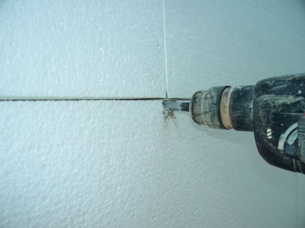 - через уложенную на цокольный профиль плиту высверливают отверстия в стене. Выполняют крепеж на 5 точек: в середине и углах листа;