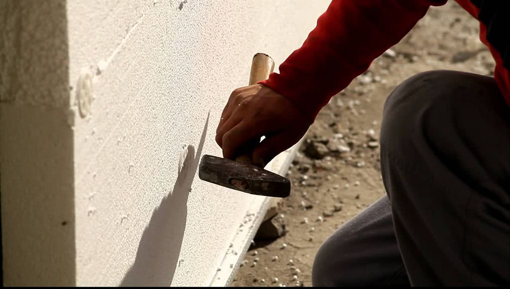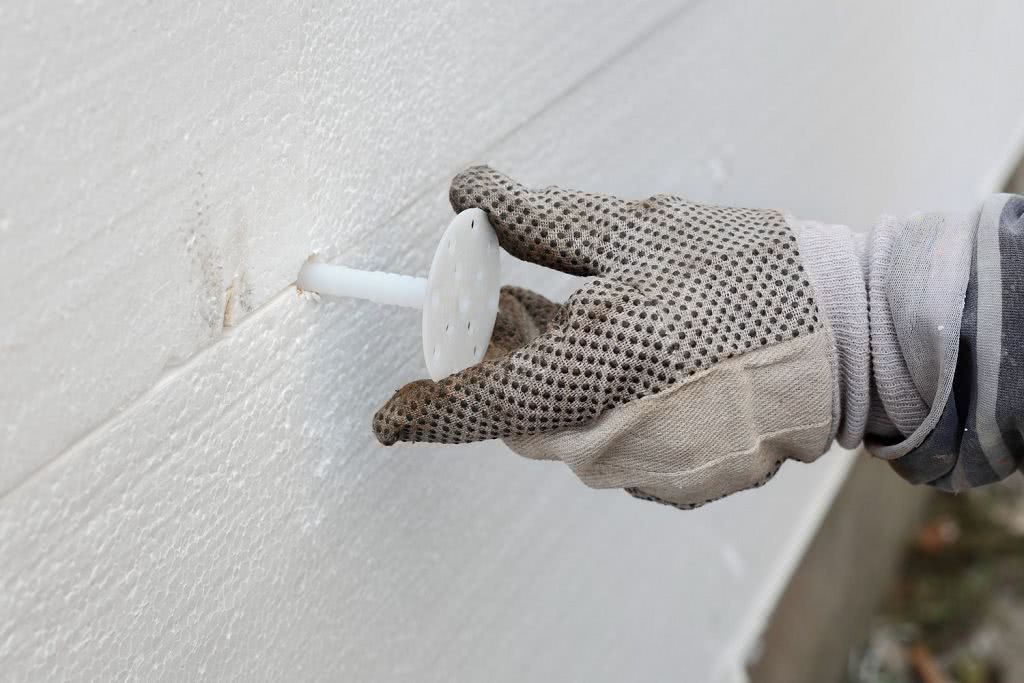 Крепление к стене осуществляется на клей, а после высыхания раствора материал дополнительно фиксируется дюбелями-грибками. Перед тем, как приступать к закреплению дюбелями, лучше выждать примерно 3 дня. Если теплотехнический расчет был выполнен правильно, а при монтаже не нарушалась технология, пенопласт будет долговечным и надежным.