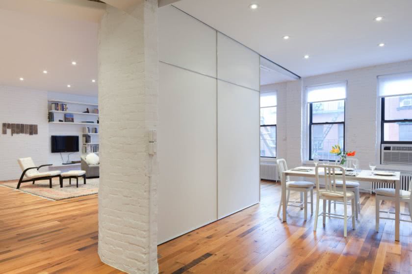 Необязательно сносить всю конструкцию несущей стены для создания кухни-гостиной с раздвижными дверями. Поэтому в большей части квартир-студий и небольших помещениях можно встретить выдвижные перегородки.