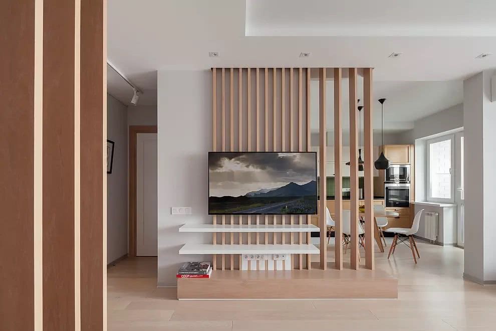 Отделить кухню от гостевой части с помощью цвета, мебели и других приёмов бывает недостаточно. С помощью полупрозрачной, декоративной конструкции можно быстро и легко обозначить функциональные центры.