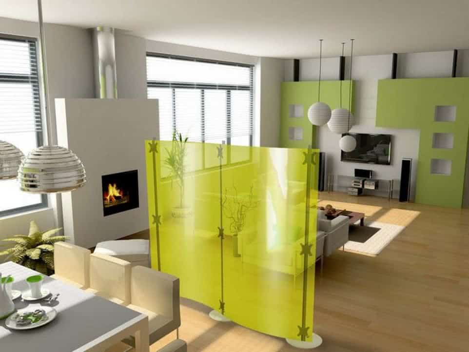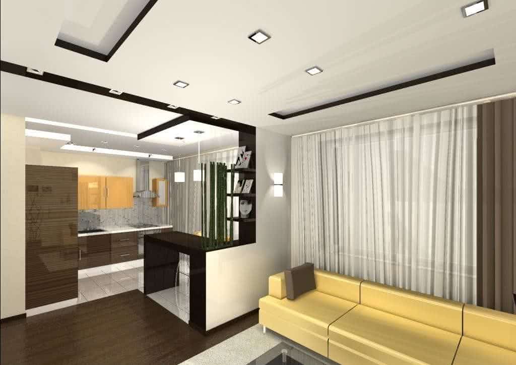 Позволяет использовать любой материал для разделения кухни и гостиной комнаты. Это могут быть шторы, ширма и даже аквариум. Главное, чтобы декоративная конструкция идеально сочеталась с интерьером дома.