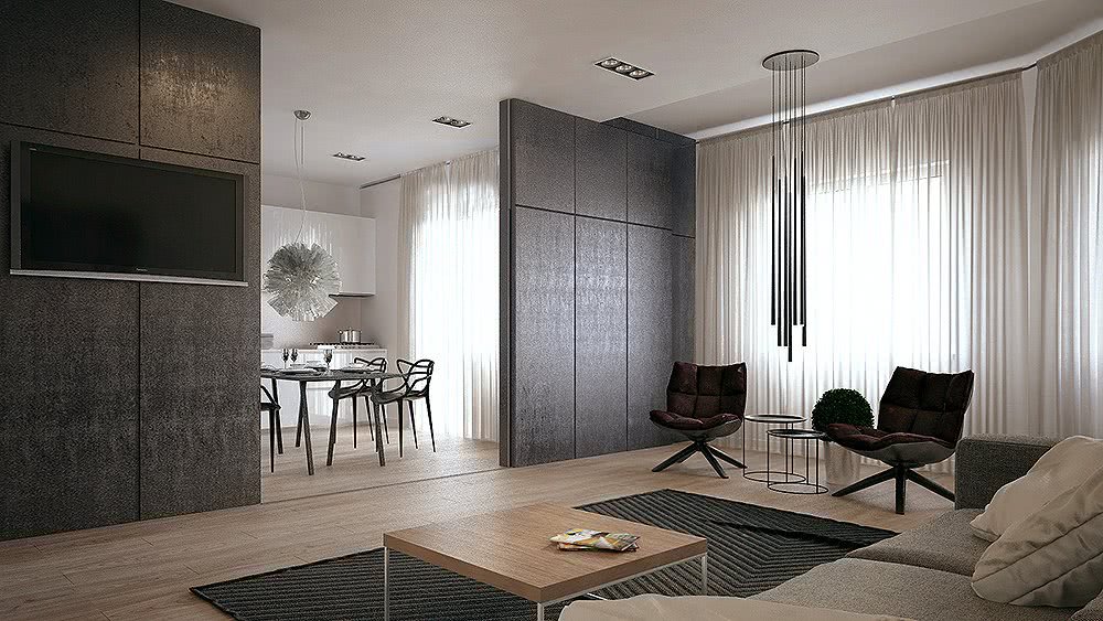 Выбор конструкции осуществляется с учетом многих факторов. Самым важным выступает площадь. Так, при небольших размерах пространство функциональную не устанавливают, так как она занимает много места. На фото – перегородки между кухней и гостиной.