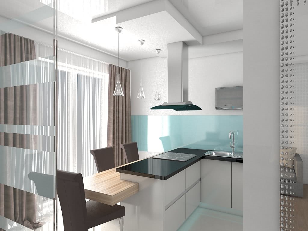 Чем меньше площадь студии, тем меньше она нуждается в какой-либо перегородке, отгораживающей зону кухни. Иначе визуально квартира будет выглядеть совсем крохотной. Зонирование подчеркивают выступающей барной стойкой, стеллажами, фальшбалками и другими способами.