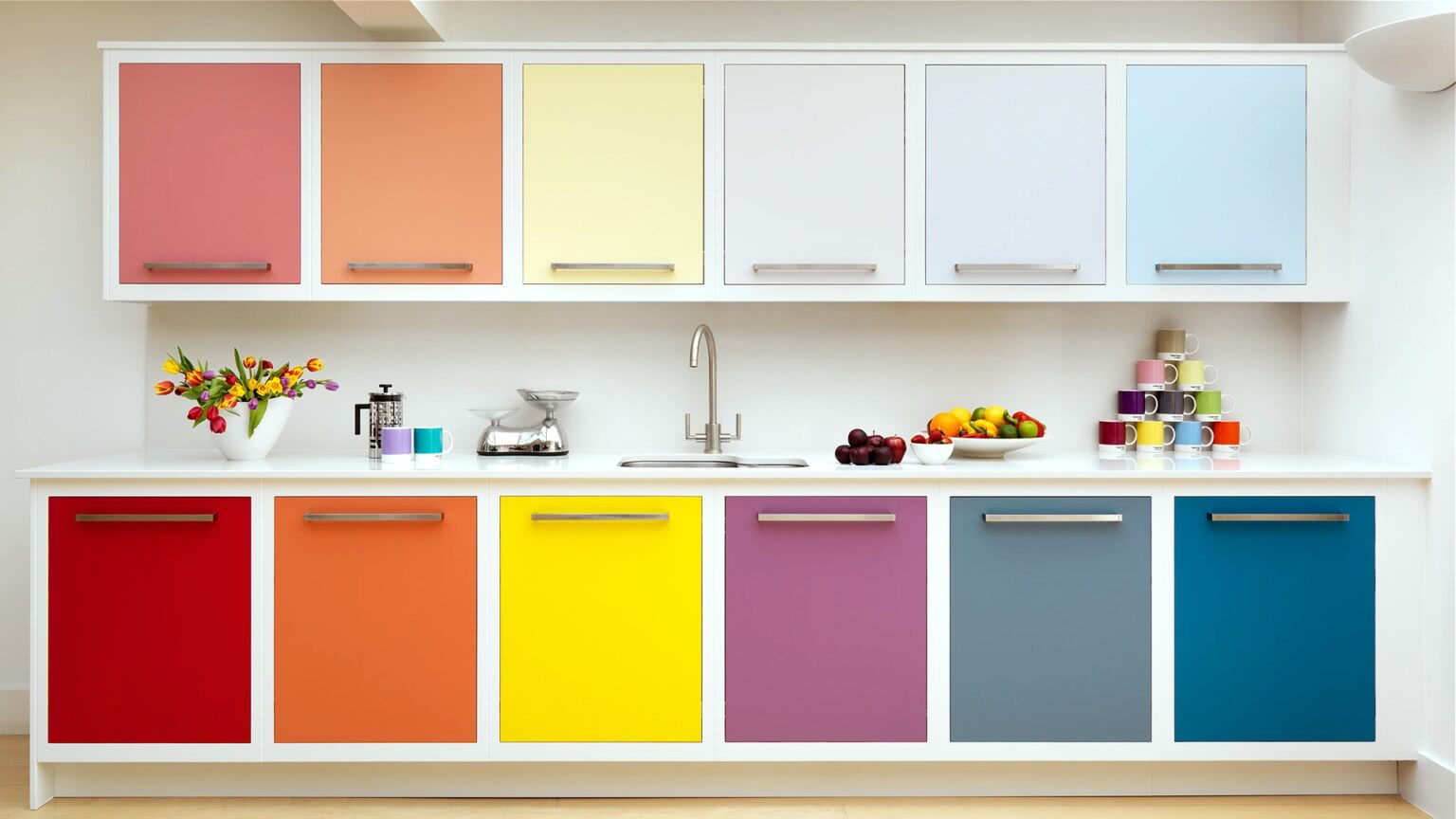 Если хотите яркую и запоминающуюся кухню, объедините противоположные оттенки цветового круга. К примеру, оранжевый с синим, бирюзовый с розовым, лимонный с сиреневым и т.д. Для создания умиротворяющей атмосферы подойдут цвета-соседи: желтый и оранжевый, зеленый и голубой.