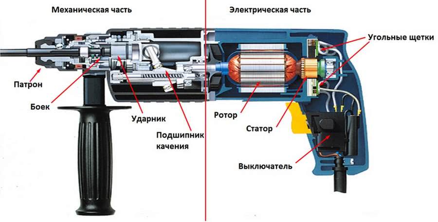 Основной конструктивной частью является механизм электропневматического или электромеханического действия. Именно благодаря этому механизму получается ударное усилие, которым пробиваются отверстия в камне или бетоне. Особенностью также будет то, что рабочему не нужно будет прикладывать большое усилие на рукоятку. Бывают такие модели, что ударная часть сделана точно такой же, как у дрели. Однако такая конструкция будет обладать меньшей прочностью, чем пневматическая или электромеханическая.