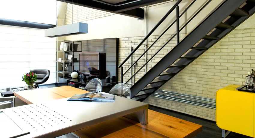 - Лофт. Лучшее решение — металл в любом виде. Трубы, тросы, арматуры, листы. Декора не требуется, такие перила для лестниц итак станут акцентом.