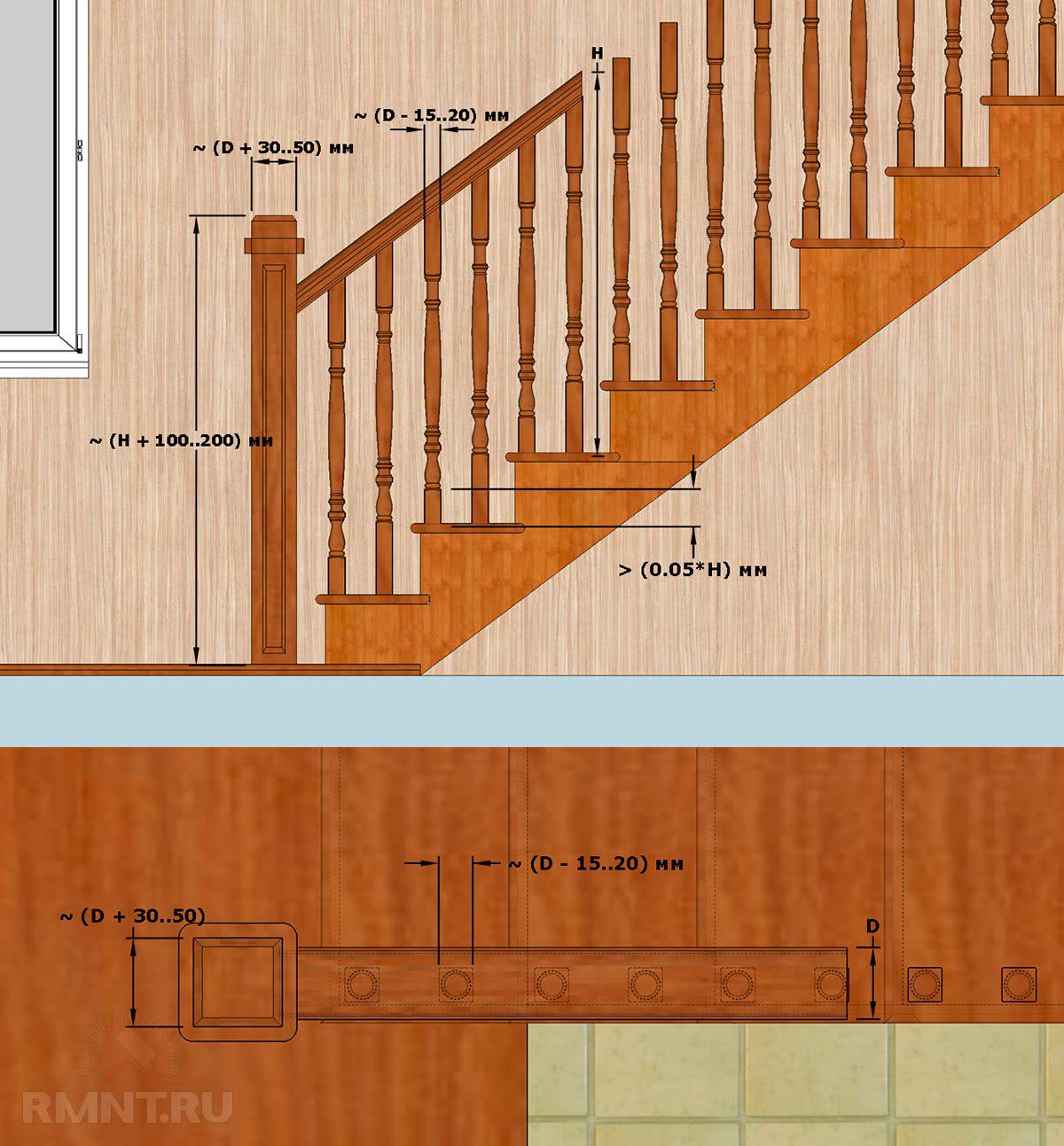 Высота деревянных перил, как и любых других, должна быть 90–100 см. Расстояние между опорами рекомендуется удерживать в диапазоне 14–21 см. Точное расстояние можно посчитать, исходя из ширины ступеней. Если в доме есть маленькие дети, то расстояние следует выбрать поменьше, чтобы никто не мог просунуть голову между балясинами и упасть вниз или застрять.