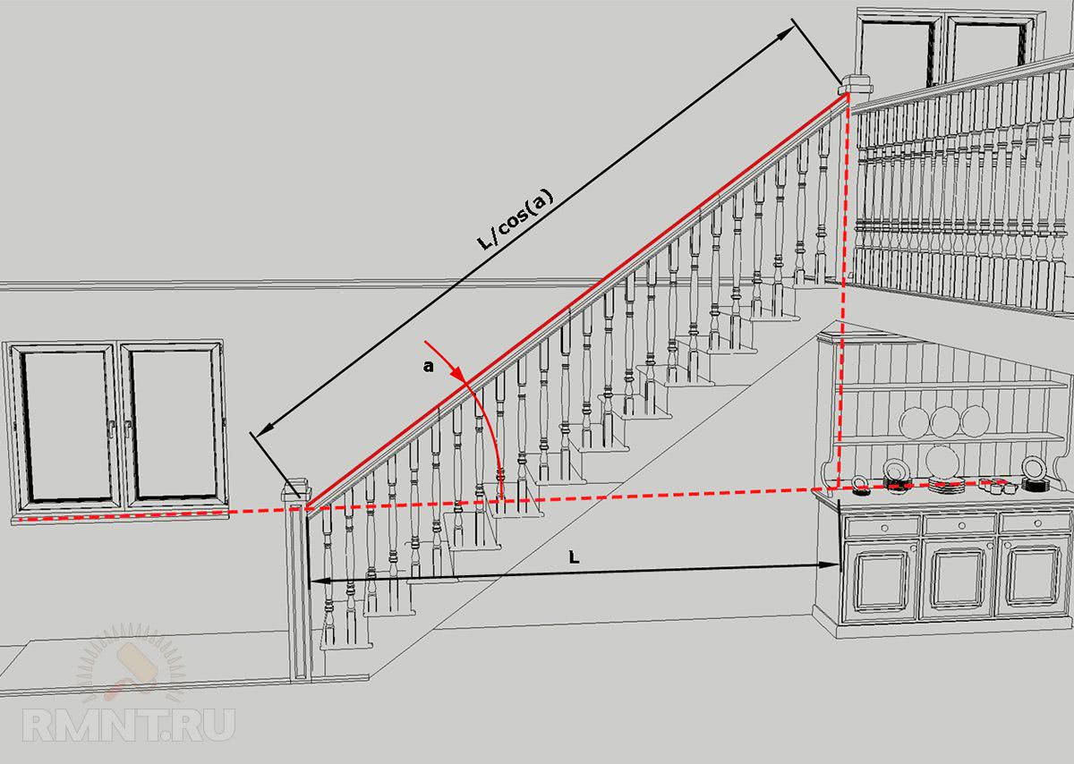 В пространстве отдельные части перил могут располагаться строго горизонтально и под общим уклоном лестницы. Расчёт длины и размеров горизонтальных сегментов можно произвести путём отображения эскиза ограждений на чертеже плана лестницы. Похожим образом рассчитывают и наклонные элементы, но для вычисления их фактической длины необходимо разделить длину проекции на косинус угла, под которым наклонён лестничный пролёт относительно горизонтальной нормали.