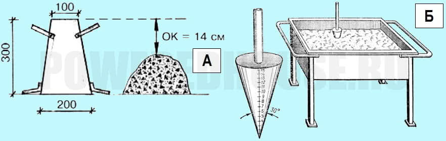 - Для бетонов — осадке конуса 2 — 4 см (на рисунке выше отмечено буквой А).