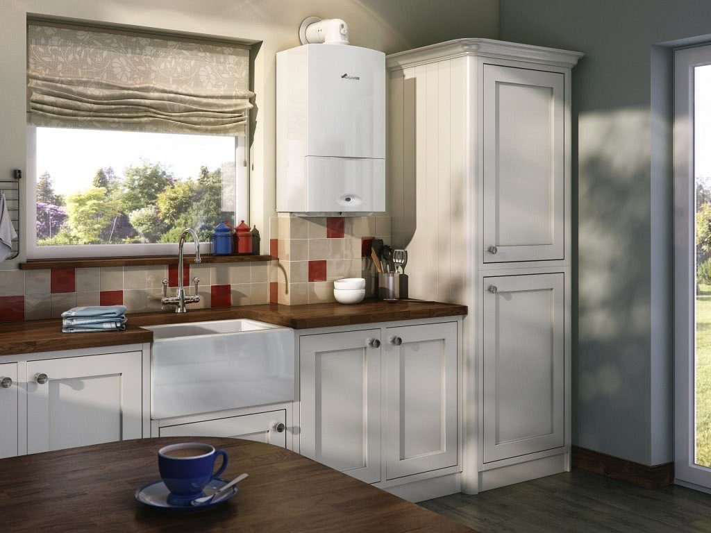 Такой вариант декорирования считается идеальным для кухонного пространства. Ведь котел практически не будет видно, и он не будет портить общий интерьер кухни.