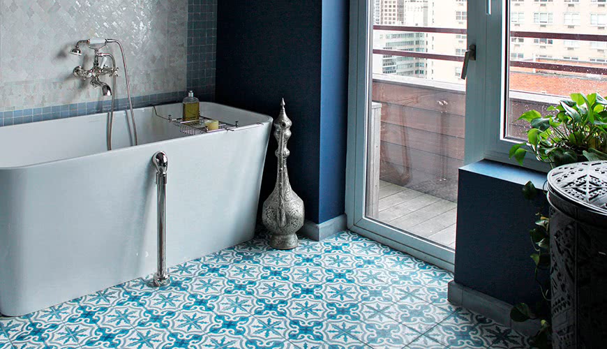 Классика в сочетании с современностью также является одним из трендов при выборе плитки для этого помещения. Восточные, марокканские узоры в сочетании с плиткой, имитирующей белый кирпич, придают в этой комнате желаемый контраст.