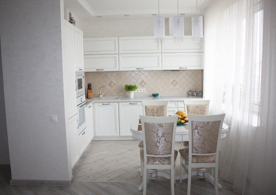 На фото интерьер кухни с напольной плиткой прямоугольной формы, выполненной в белом цвете.