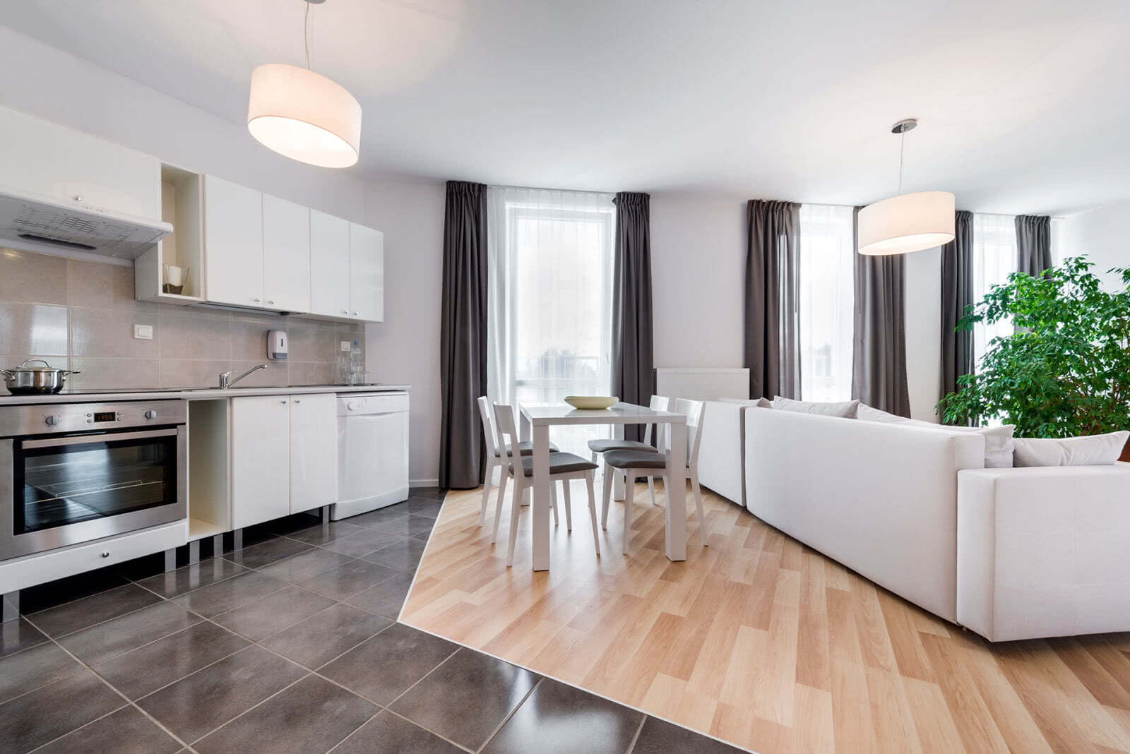 Если у вас квартира-студия, то отличным приемом может стать зонирование. С его помощью светлую плитку можно будет расположить в зоне готовки, а, например, обеденную зону или зону отдыха можно будет оформить более темным оттенком плитки или каким-либо другим покрытием для пола.