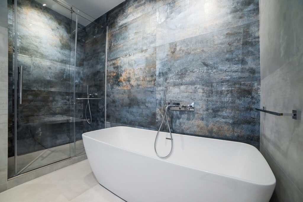 Плитка для ванных комнат и кухонь с металлической отделкой уже появлялась в прошлогодних предложениях производителей плитки для ванных комнат и кухонь. Однако в этом году металл — одна из самых важных тенденций, и в ванных комнатах от пола до потолка появляются отблески серебра, золота или меди.