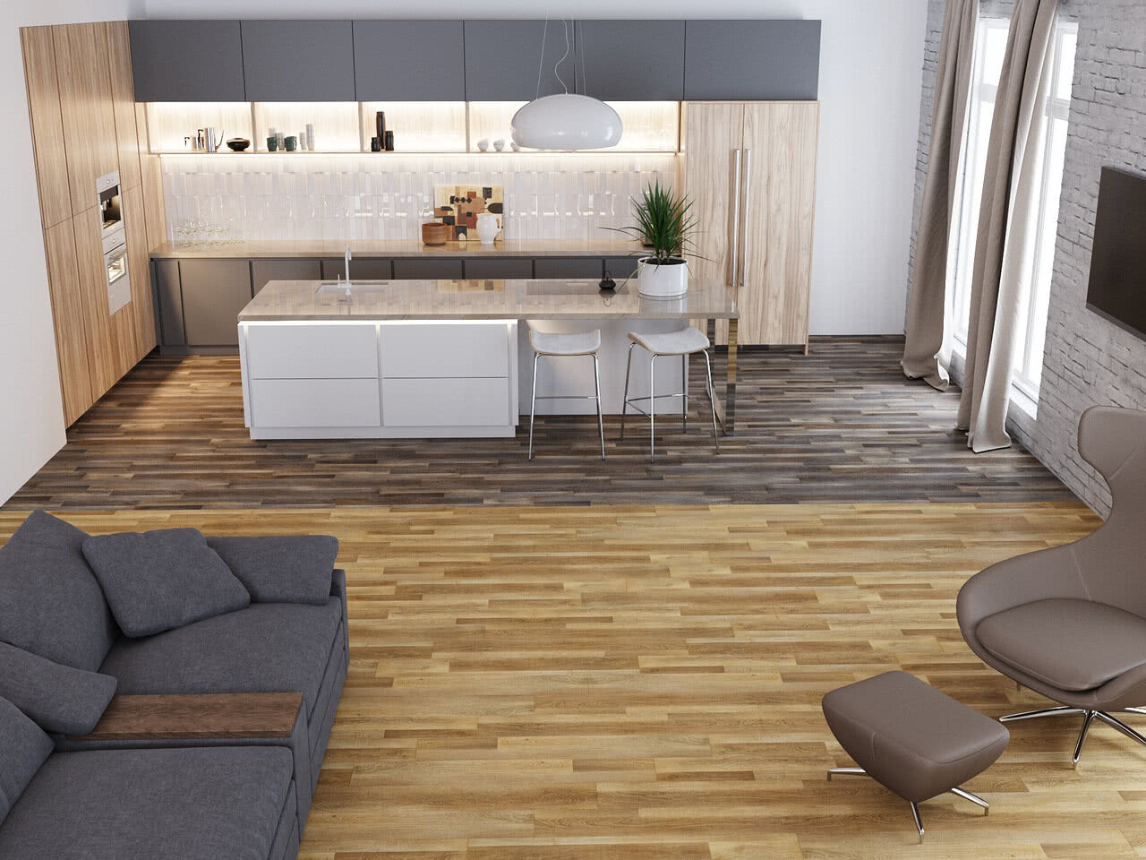 Плитка под дерево прекрасно подходит как для гостиной, так и для кухни. Керамическая плитка является идеальной идеей для людей, которые любят дерево на полу, но хотят избежать необходимости его ухода, чистки, лакирования. Плитка может выглядеть как разные типы досок, но ее гораздо легче поддерживать в порядке. Платины, выложенные в классическом стиле, напоминает деревянный паркетный пол.