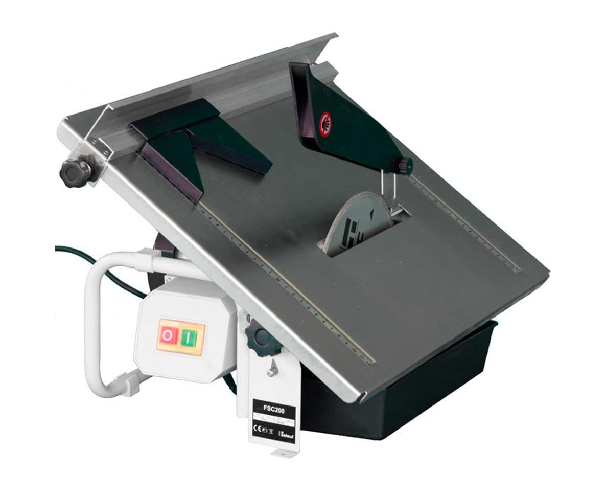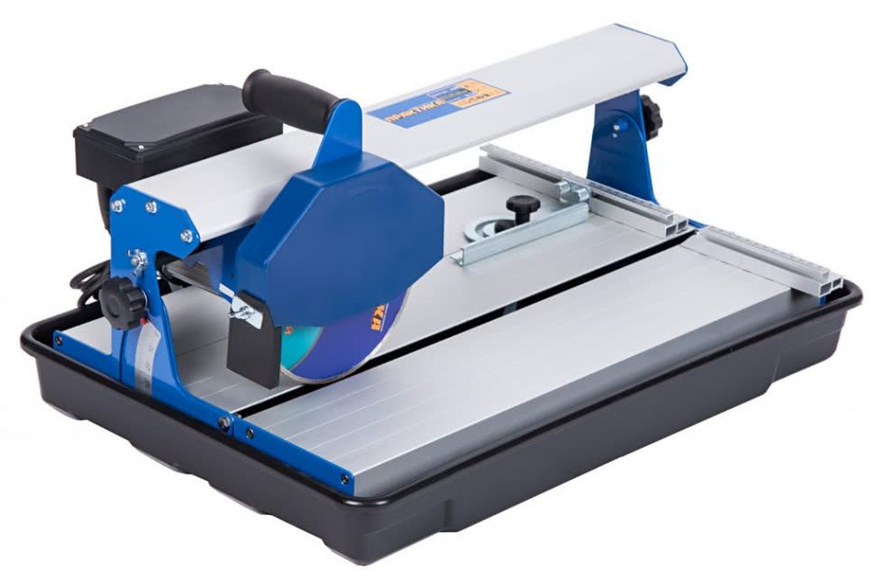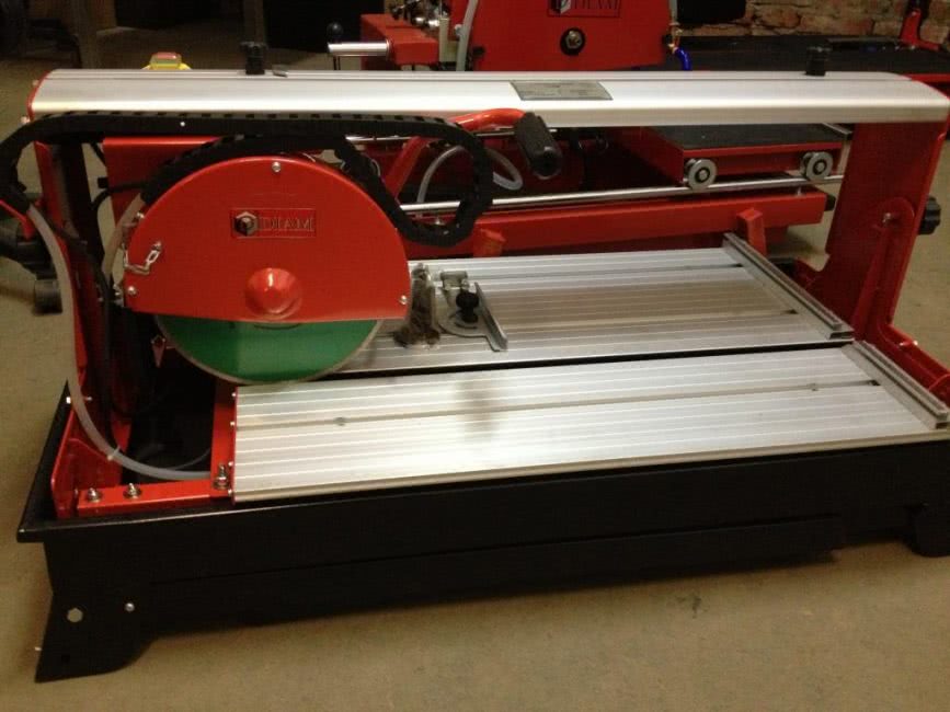Производительный плиткорез считается профессионального типа. Под прямым углом на станке можно сделать пропил глубиной до 52 мм. Мощность двигателя 1,2 кВт. Частота вращения шпинделя достигает 2950 об/мин. Плиткорез работает с алмазными кругами диаметром до 250 мм. В зависимости от назначения диски ставят меньшего размера, но с внутренним посадочным гнездом диаметром 25 мм. Минусом считается большой вес электрического станка – 64 кг.
