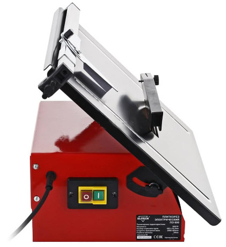 Тем, кто хочет выбрать недорогой, но хороший электрический плиткорез, можно обратить внимание на модель ELITECH ПЭ 600, предназначенную для работы с плитами из гранита, мрамора, керамогранита или бетона. Для удобства оператора в устройстве предусмотрена возможность наклона рабочего стола на угол до 45°. Встроенный УЗО предохраняет прибор от перепадов напряжения и перегрева
