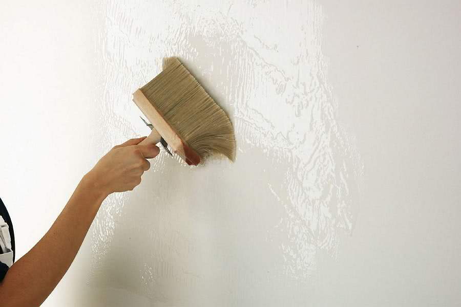 На просохшую стену наносим жидко разведенный обойный клей. Так удастся избавиться от мелких дефектов стен. После высыхания этого слоя поверхность будет готова к финальной отделке.