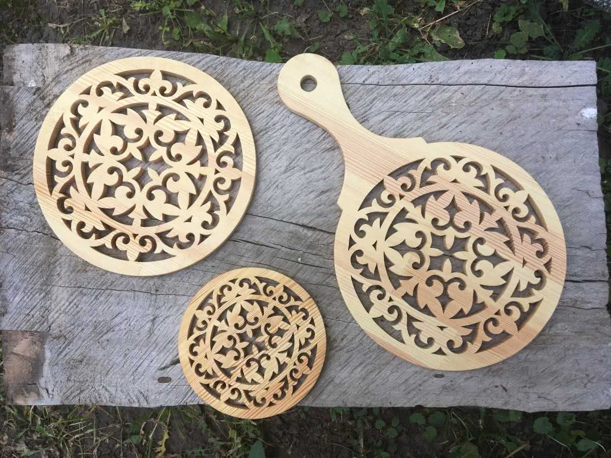 - Поделки для кухни. На рисунке показаны примеры выполнения кухонных поделок. Из деревянных срезов получаются красивые и прочные подставки для посуды (в т. ч. горячей), а также доски для резания продуктов. Поделку можно сделать из одного спила створа большого диаметра или собрать из нескольких элементов, соединив сбоку