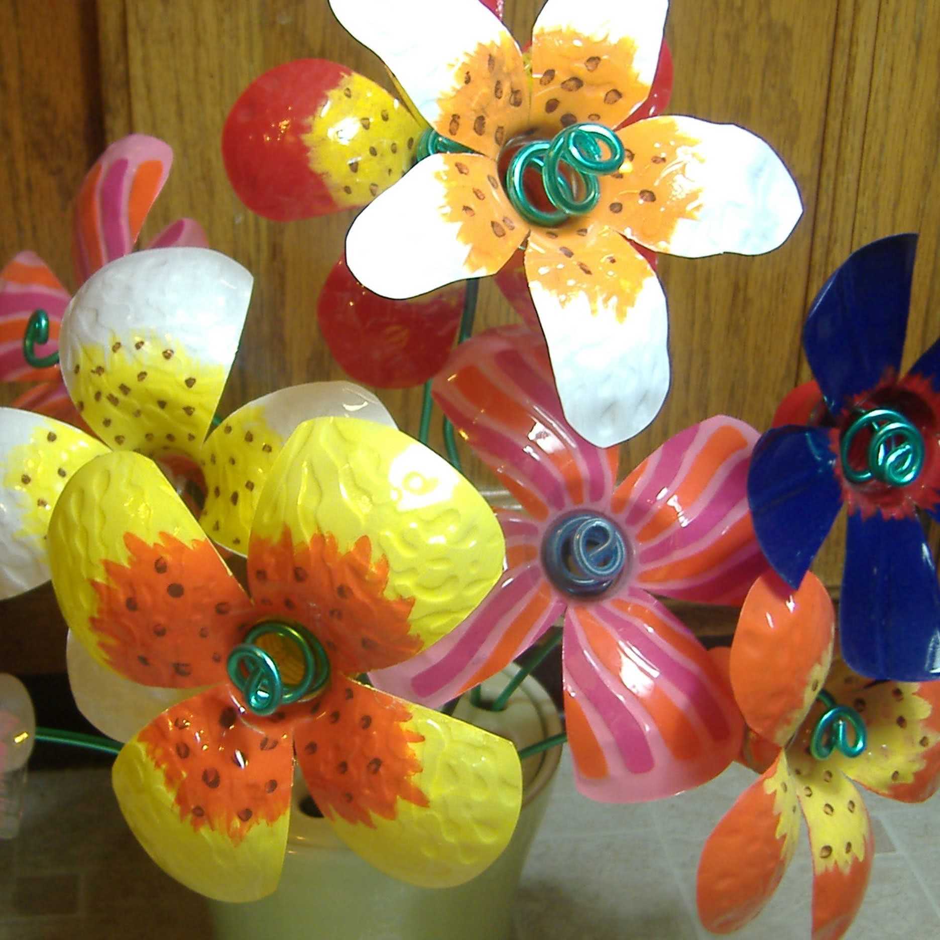 Зеленые бутылки используйте для создания листьев и стеблей. Чтобы можно было согнуть стебельки, возьмите проволоку. Ниже вы увидите несколько примеров таких поделок.