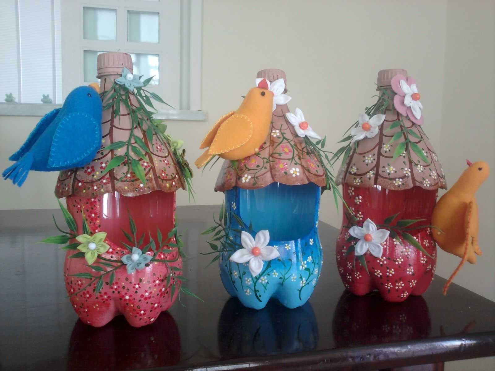 На фото вы увидите пример того, какие оригинальные дачные поделки из пластиковых бутылок могут у вас получиться.