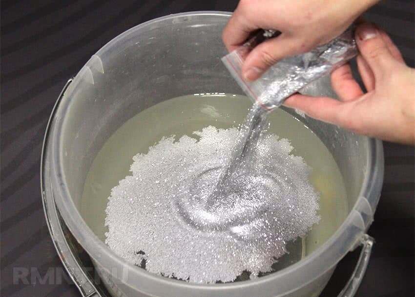 Итак, за основу берётся клеевой состав, будь то бустилат, обойный клей или акрил. Добавляются первыми всегда красители и тщательно перемешиваются с клеем, элементы декора: блёстки, слюда, кварцевый песок, мраморная крошка и любые минеральные вещества, которые помогут сделать обои неповторимыми и индивидуальными, можно смешать неравномерно, в этом и проявится неповторимость.