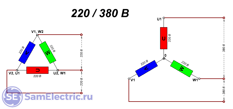 Двигатель на 220/380 В. Напряжения питания при включении по схемам “Звезда” и “Треугольник”