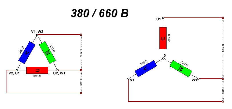 Двигатель на 380/660 В. Напряжения питания при включении по схемам “Звезда” и “Треугольник”