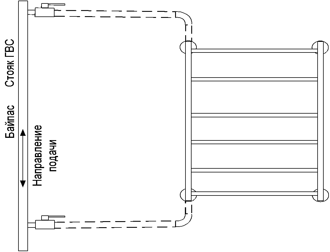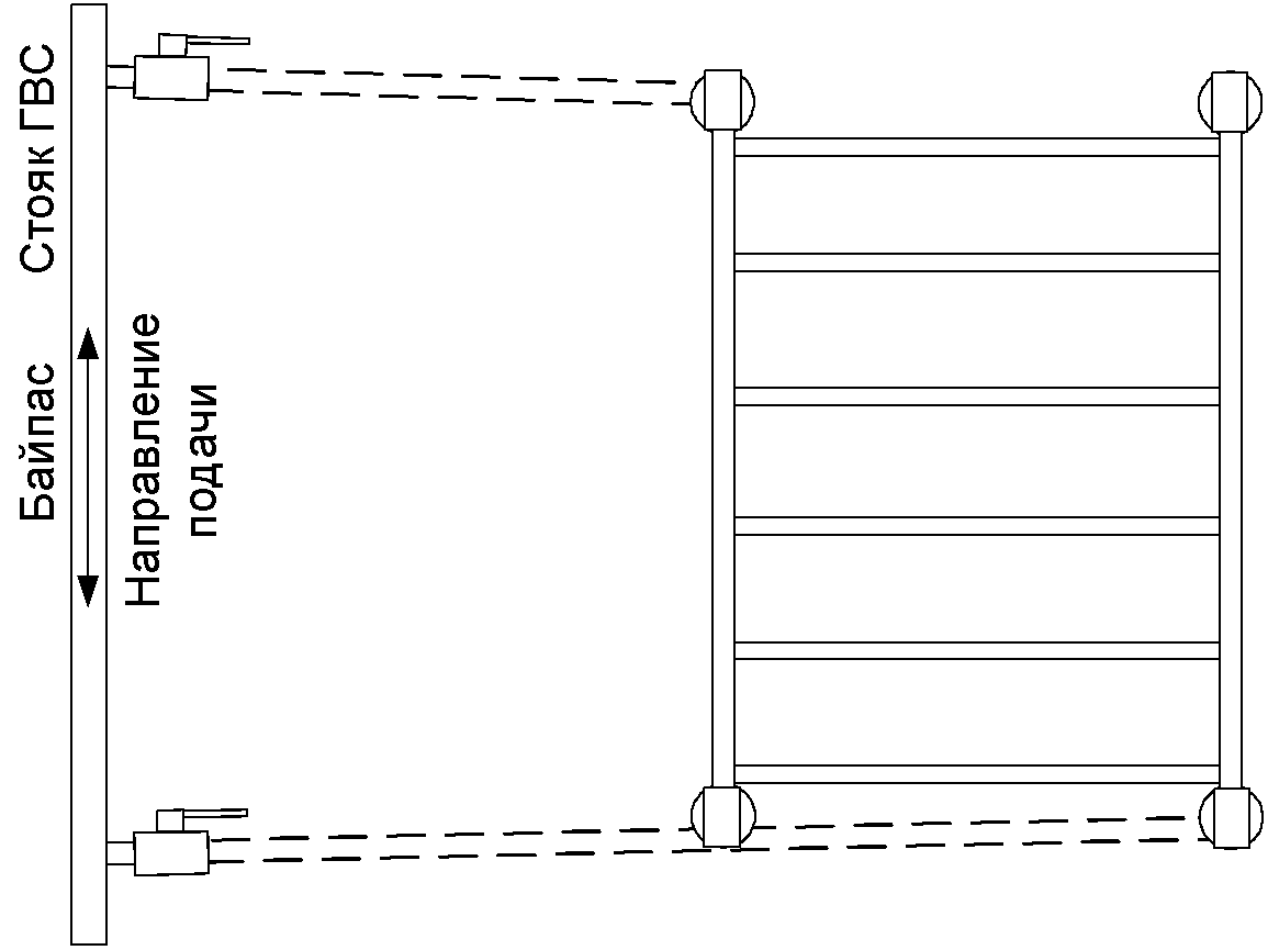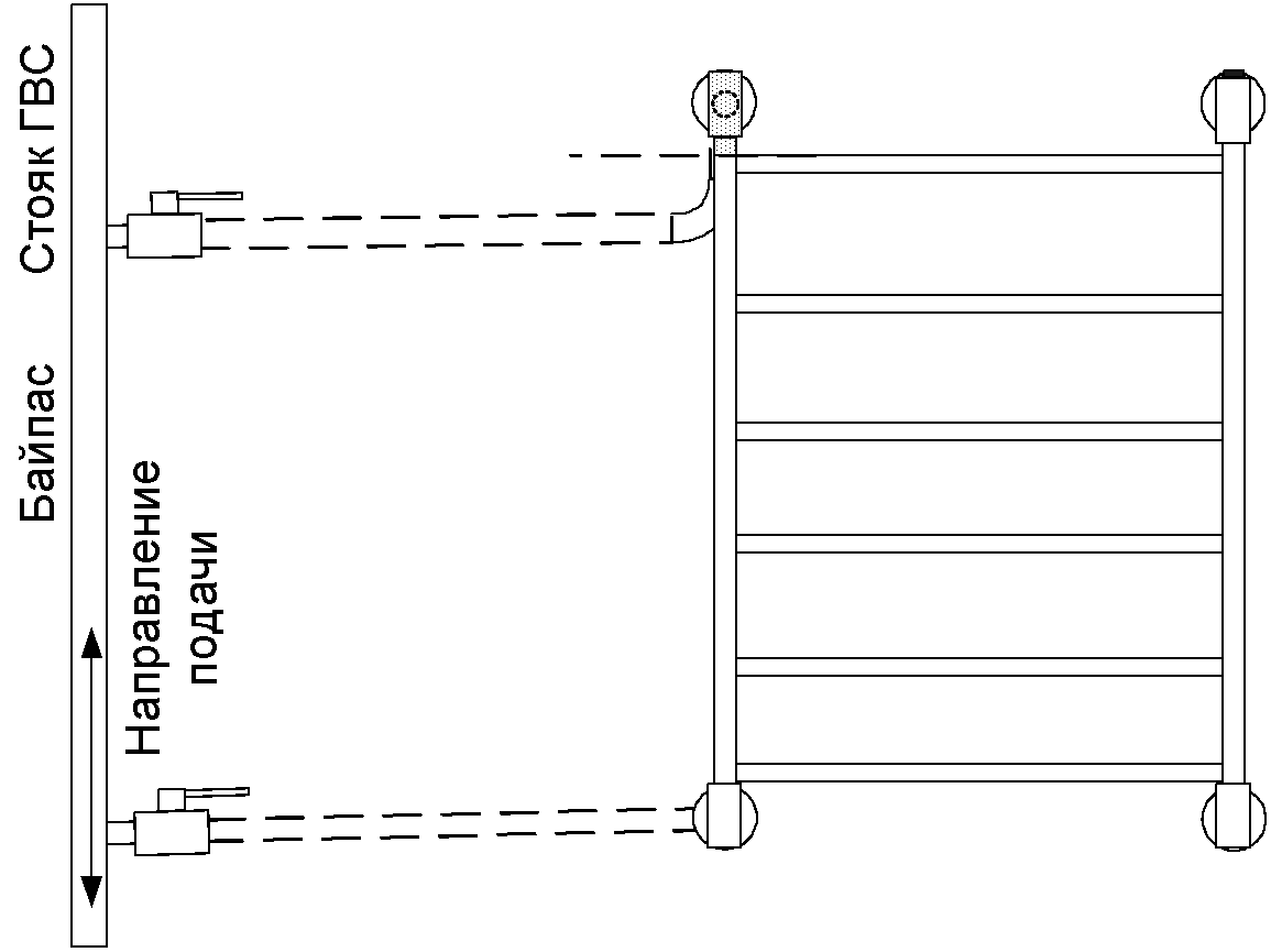 Данная схема обеспечивает подачу теплоносителя в верхнюю часть и выпуск остывшего теплоносителя обратно в стояк снизу. Циркуляция через полотенцесушитель обеспечивается только гравитационным напором остывающей в нём воды.