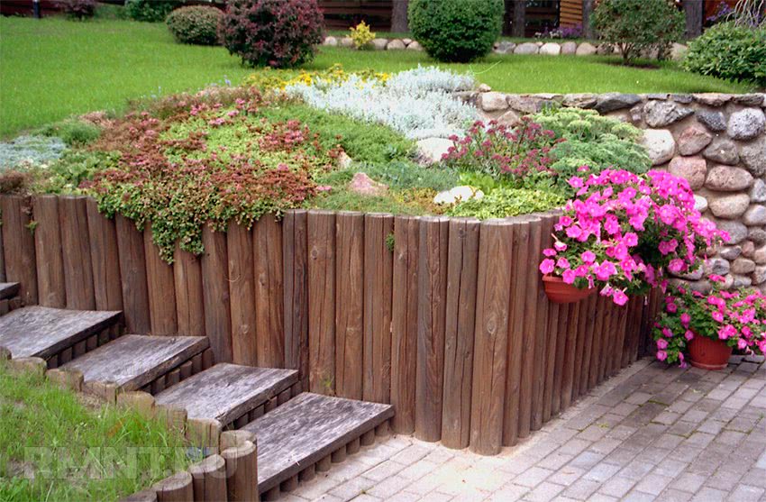 Выбранный материал для постройки подпорных стенок должен объясняться конкретными дизайнерскими решениями. Это было бы логично. Ведь для «возвышения» монументальности опоры применяется рельефный, фактурный материал. Также в данном случае приветствуется установка больших гранитных камней, уложенных крупным швом. А ещё здесь уместно использование мощного бревна. Для создания более утончённого, в какой-то степени незаметного, но с другой стороны элегантного рельефа облицовка стен делается с помощью мелких камней и штукатурки.