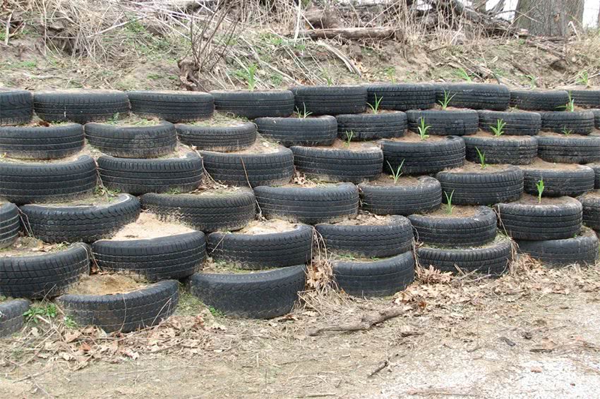 С использованием автошин как основы конструкции можно получить достаточно надежные стены. Они способны удержать значительные объемы почвы и препятствуют его сползанию вниз. Данный способ закрепления склона является достаточно недорогим по стоимости и требует незначительного времени.