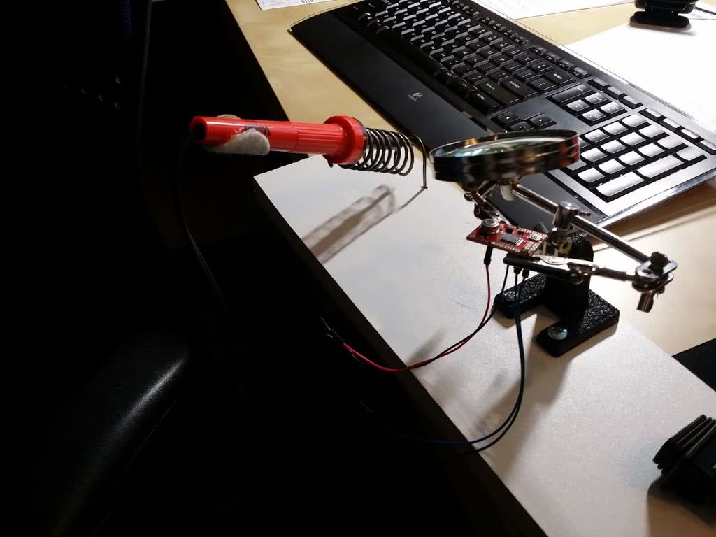 При пайке часто необходимо приспособление «третья рука», но всегда загромождать стол такими приспособами не нужно — достаточно приделать к подставке зажим типа «крокодил», который закреплён при помощи пайки на винте:
