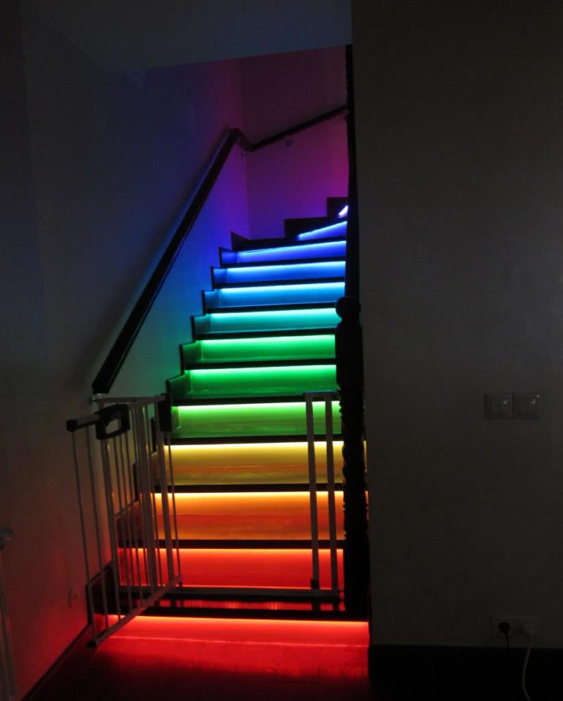 Любую выбранную схему можно адаптировать и усовершенствовать. Например, если вы поставите разноцветные диодные источники для лестницы, от этого общий вид подсветки преобразится. Еще одно интересное решение – поставить датчики на каждую ступеньку. В этом случае они будут загораться поочередно по мере вашего перемещения. Однако это решение требует немалых материальных затрат.