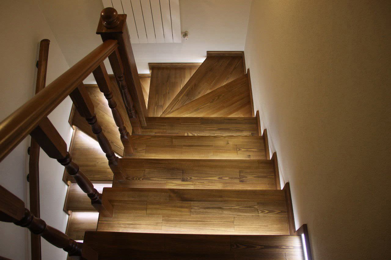 Древесина, с одной стороны, хорошо поддающийся обработке материал. В деревянной лестнице можно легко проделывать ниши для монтажа приборов с подсветкой любого типа. С другой стороны, светильники должны быть пожаробезопасными – либо они должны мало выделять тепла, либо оно должно эффективно от них отводиться. Оптимальный вариант – светодиодные ленты.