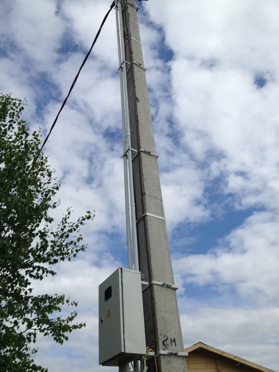 - Далее, к этому столбу монтируется щиток распределения, на который и подключается электрокабель. Таким образом, если высота здания не соответствует нормативам, можно использовать высокий столб, включив его в конструкцию постройки, обойдя ограничения.