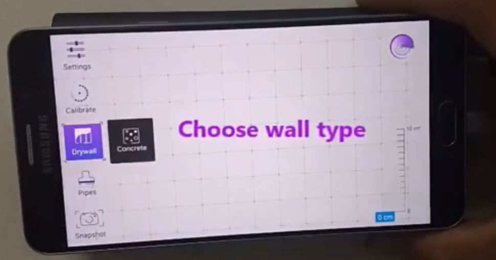 не прикладывая телефон к стене выберите режим – какой тип поверхности будет сканироваться (гипсокартон или бетон)