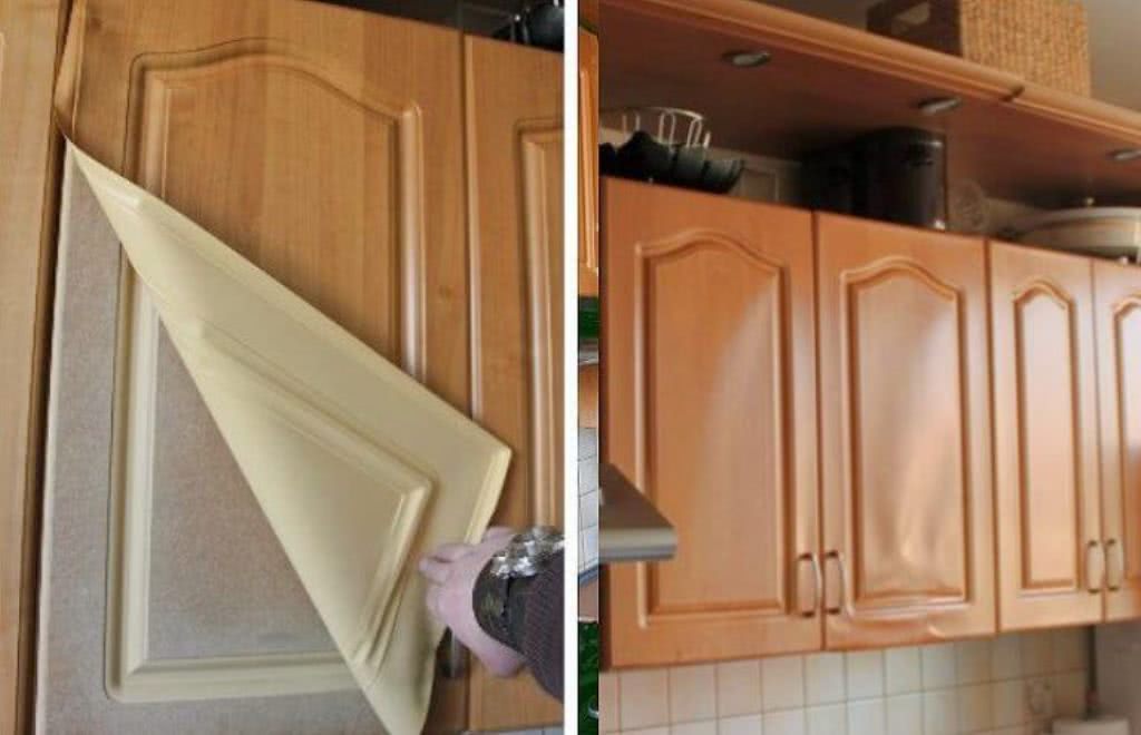 Обновить дверцы можно тканью или самоклеящейся пленкой. Покрытие бывает однотонным или с рисунком, имитирующим дерево, мрамор, кафель, кожу, металл, матовым или глянцевым, гладким или фактурным. Виниловая пленка не пропускает влагу, устойчива к повышенной температуре, механическим повреждениям.