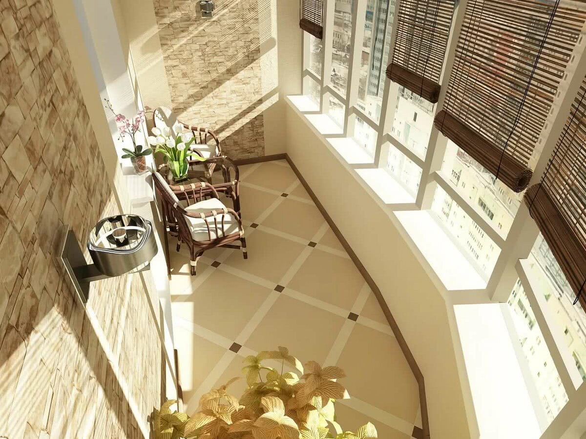 Также следует брать во внимание тип лоджии. Если это открытый балкон, то следует выполнить бетонную стяжку с керамзитом, а в качестве окончательной отделки использовать керамическую или кафельную плитку, керамогранит, искусственный или натуральный камень