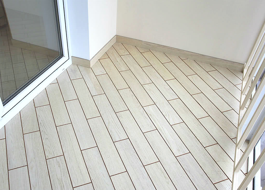 Укладка материала выполняется и на деревянную, и бетонную основу, главное, чтобы она была максимально ровной. Если у вас на балконе деревянный пол, вы можете освежить интерьер, уложив сверху на доски плитку. Такой ремонт займет минимум времени, а результат будет весьма эффектным. Если укладка производится на цементную стяжку, предварительно выполняют шлифовку и очистку поверхности от пыли, затем грунтуют. При монтаже на пыльную или неровную основу качество покрытия будет очень низким.