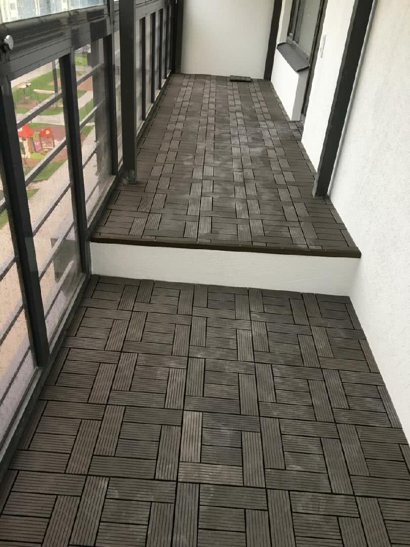 Покрытие выпускается в виде компактных модулей, которые можно укладывать на лаги или крепить на ровной поверхности, соединяя как конструктор. Недостатком декинга можно назвать только его стоимость, так как он далеко не всем по карману. Садовый паркет подходит для полов как на открытых, так и на застекленных балконах, отлично сочетается с любым видом отделки и придает помещению нотку оригинальности.