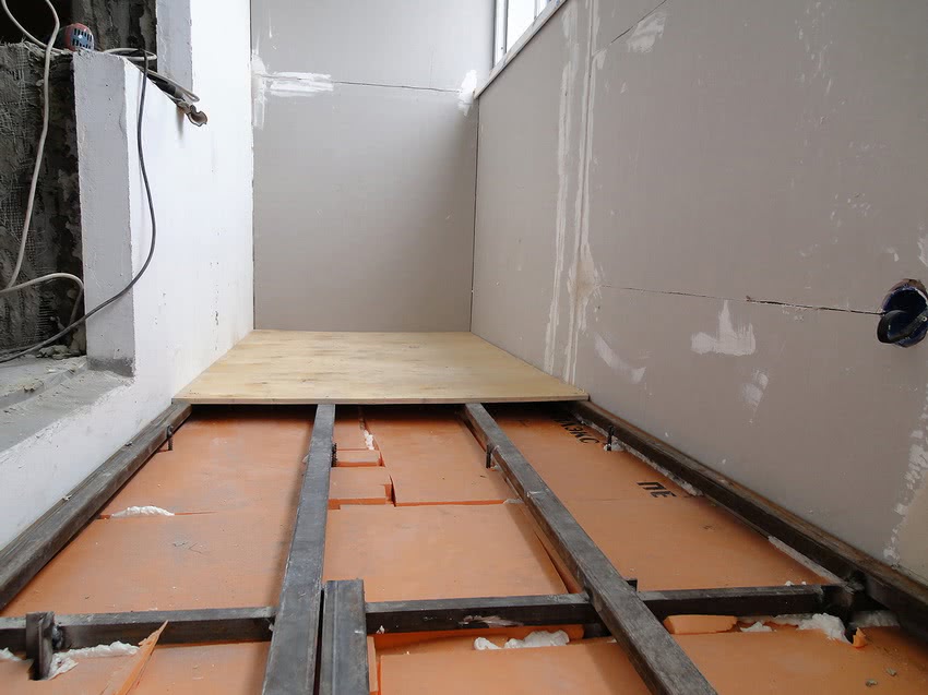 - замерить, насколько необходимо поднять пол и, на основе этой информации, выбрать необходимую теплоизоляцию для лоджии. Ее необходимо постелить на гидроизоляционный слой;
