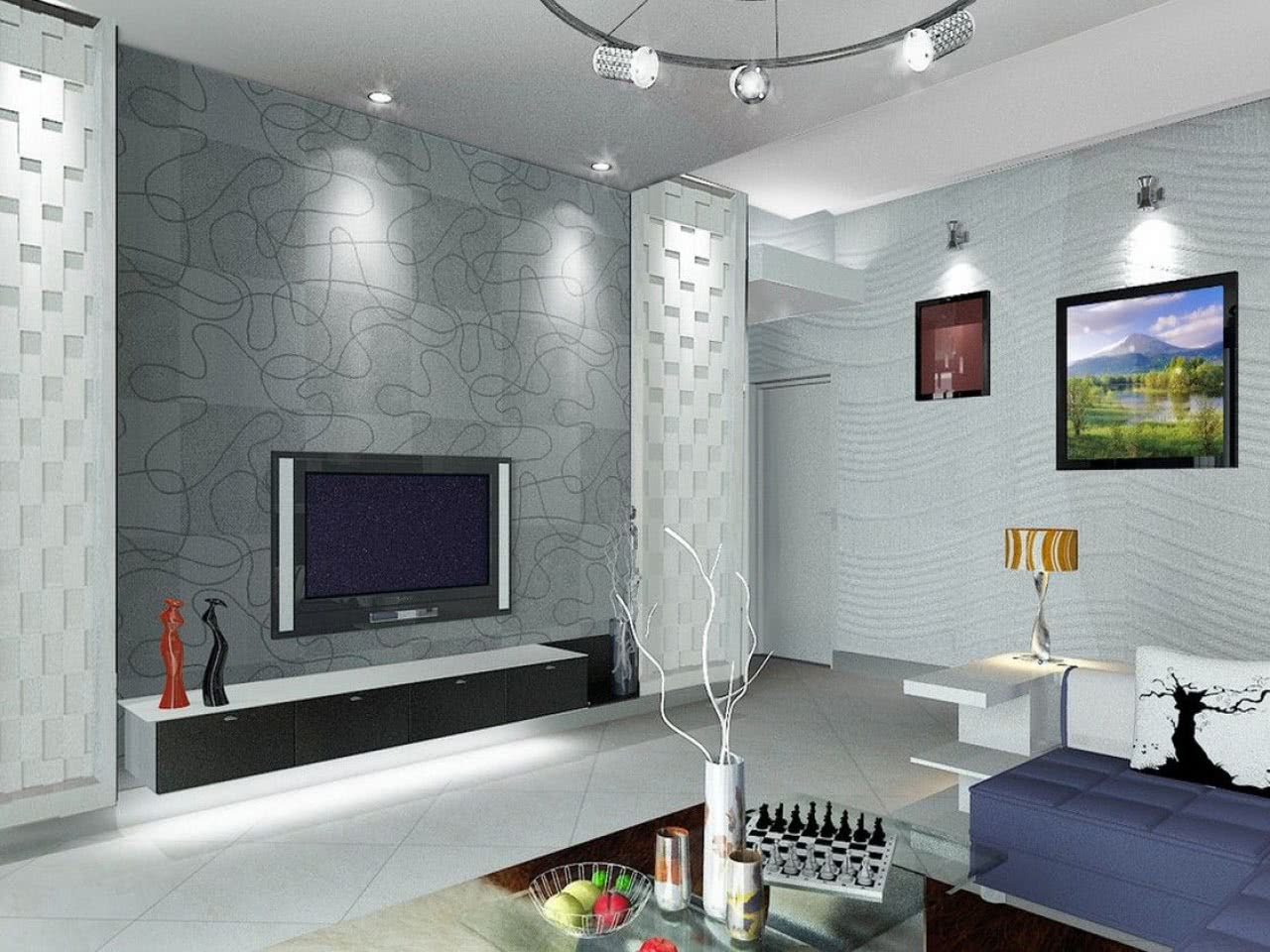 Если телевизор устанавливается на пустой стене, то он будет выглядеть несколько одиноко. Оформить стены можно различными картинами в тонких рамках. При этом учитывается, что основной элемент – телевизор, будет иметь самые большие размеры среди картин. Снизу устанавливается невысокий комод или тумба, что позволит сбалансировать интерьер.