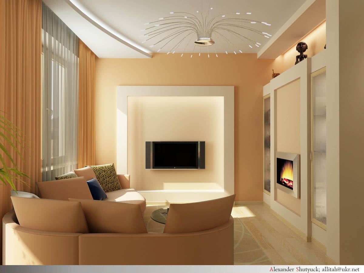 - Гостиная. Здесь условия гораздо благоприятнее, чем на кухне, поэтому можно установить полку из любого материала — дерева, МДФ или другого. Разве что ДСП не подойдёт — выглядит слишком дёшево. Полку выбирают широкую, толстую, такую, чтоб поместился большой телевизор. Установку производят так, чтобы телевизор было удобно смотреть всей семье.